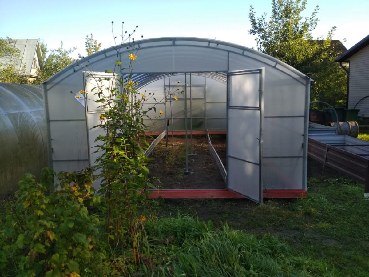 • широкая 4 м, ширина теплицы позволяет организовать 3 широкие полноценные грядки с комфортными проходами между ними;